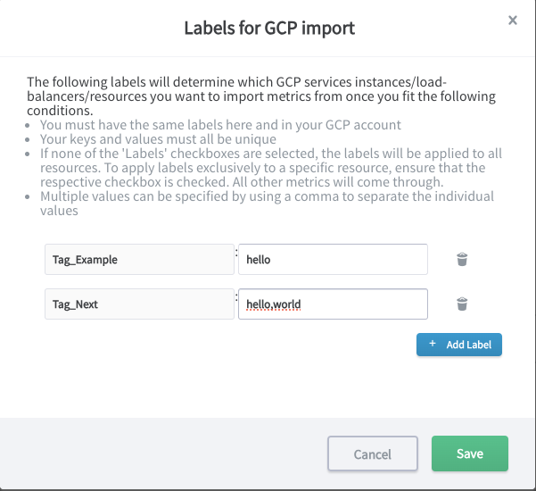 If you click **GCP Labels** you will be presented with the following screen which allows you to edit labels. Each label has a unique name (shown on the left) and one or more values. Values are separated by a comma.&#x20;