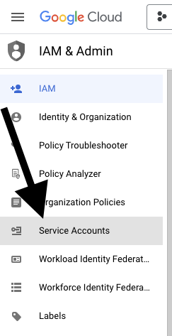 In the main Google Console page select the 'IAM & Admin' panel.  On the side panel navigate to the 'Service Account' link: